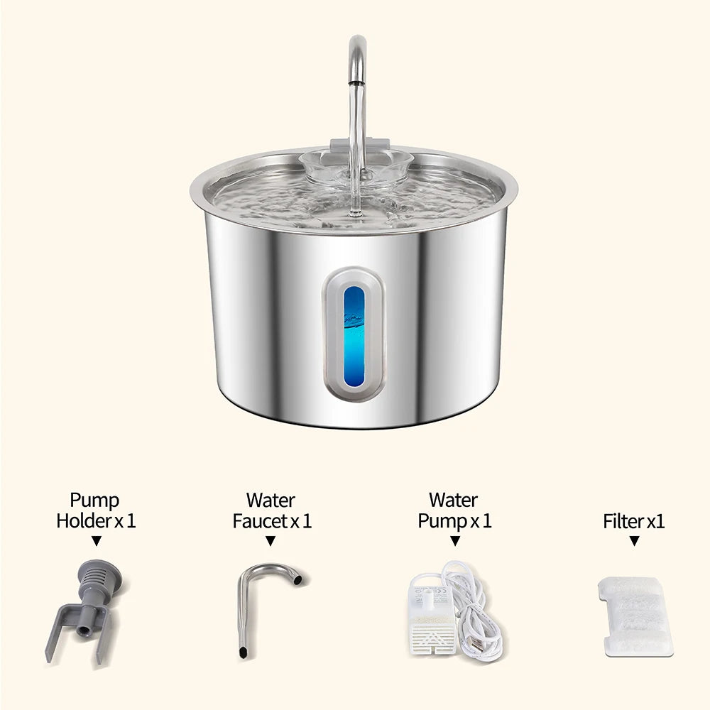 Keep your cat or dog happily hydrated with the PureFlow Pro Stainless Steel Pet Water Fountain! Designed with a generous 2.2L capacity and a multi-stage filtration system, this elegant fountain provides a continuous stream of clean, oxygenated water that encourages pets to drink more. The veterinary-grade stainless steel construction is naturally hygienic, easy to clean, and resistant to bacteria, while the ultra-quiet pump ensures peaceful operation day and night. Give your pet the fresh, free-flowing water they deserve!